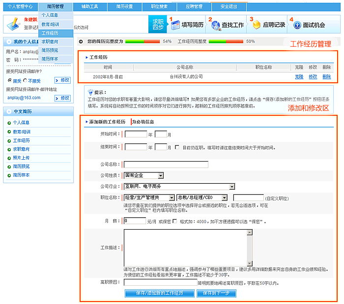 工作经历对您的求职有着重大影响,请您尽量详细填写!如果您有多家企业的工作经历,请点击“保存/ 添加新的工作经历”按钮逐条填写。系统将自动按照您工作的时间顺序对它们进行排列,越新的工作经历排列顺序越靠前。